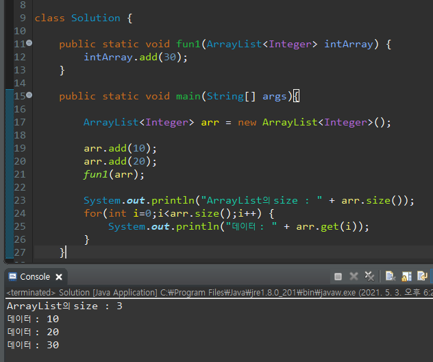 caller 에서 ArrayList에 10과 20을 넣고, callee에서 30을 넣은 뒤,