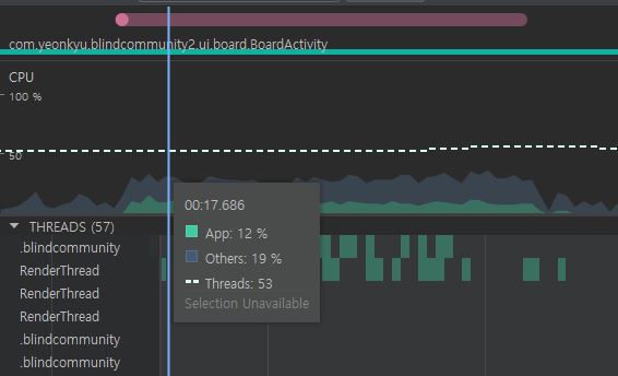 아래 사진은 Paging 적용 전/후 에서 스크롤을 위아래로 마구마구 흔들었을 때 CPU사용량을 본 것이다.