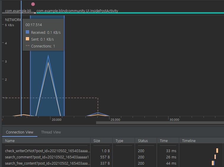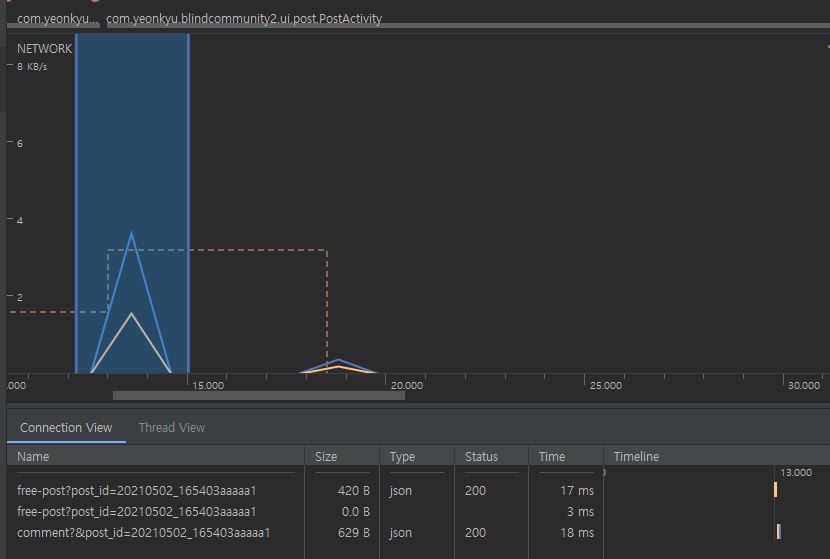 BoardActivity에서 게시물을 클릭했을 때 -> PostActivity로 넘어가는 과정에서 네트워크 성능을 비교했다.