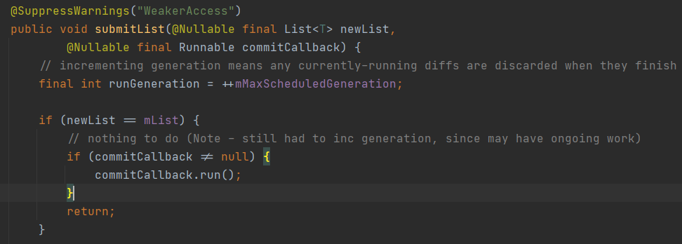 submitList의 구현 코드에서 아래와 같이 두 List가(oldList와 newList) == 인지 비교하는 Java 코드를 발견하게 되었다.