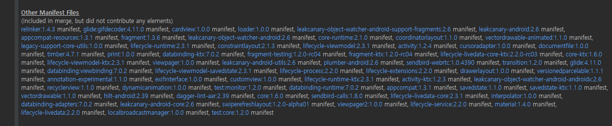 아래와 같이 문제가 되었던 세 Activity들은 아래의 라이브러리 들 중 하나에서 찾을 수 있었는데, 파란색 텍스트를 클릭하면 해당 Manifest로 이동할 수 있었다.