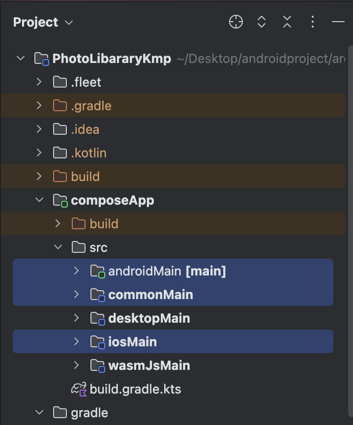 androidMain 은 android 에만 적용될 코드가, commonMain 은 모든 (android, iOS 등) 플랫폼에서 사용될 코드가, iosMain 에는 iOS에만 적용될 코드가 들어가게 된다.